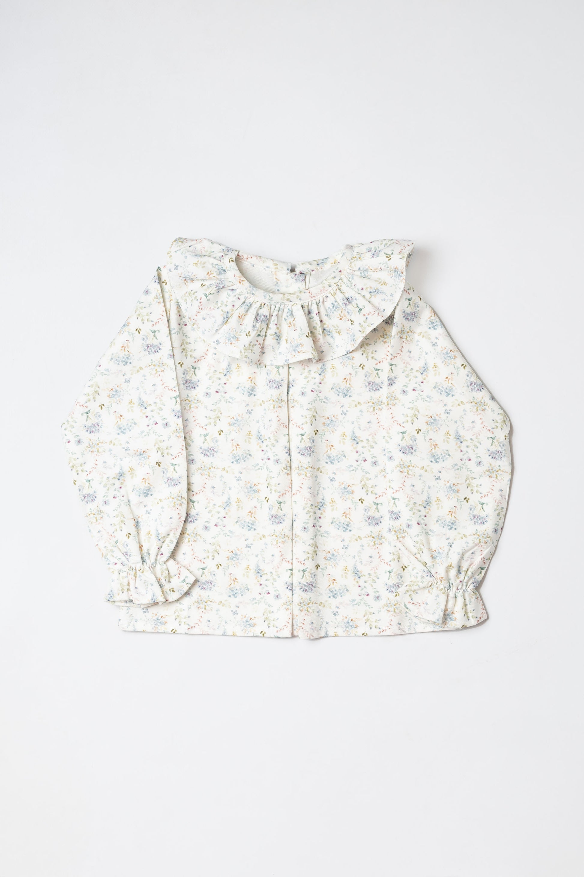 This floral blouse in shades of blue with a ruffled collar is a classic and timeless piece for a child's wardrobe. Made from soft, comfortable 100% cotton fabric, it features long sleeves with gathered cuffs and a wide ruffled collar, adding a romantic and elegant touch to the look. Perfect for pairing with rompers, overalls, or skirts, it's ideal for special occasions and everyday wear, ensuring comfort in every detail. Fastens at the back with mother-of-pearl buttons.