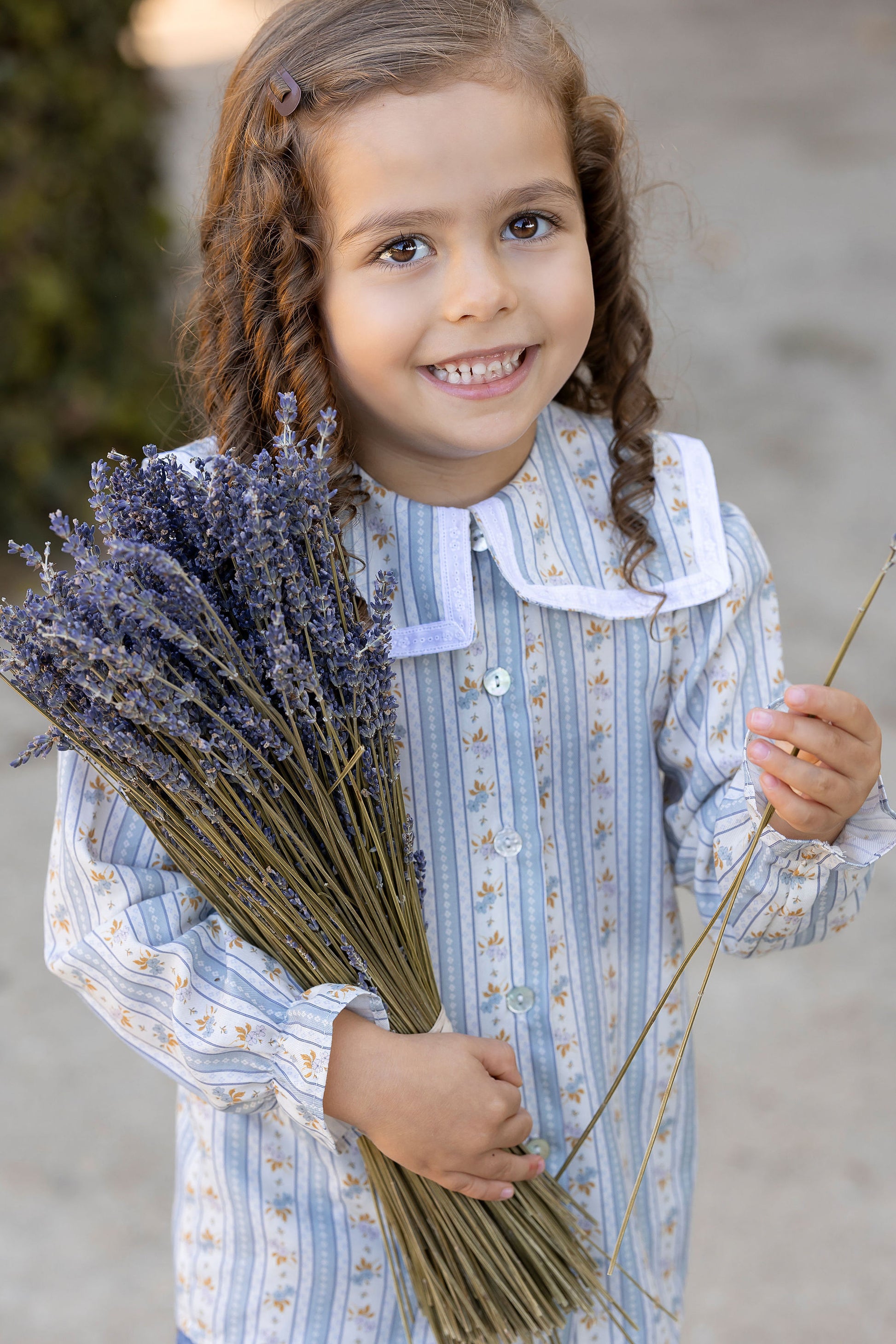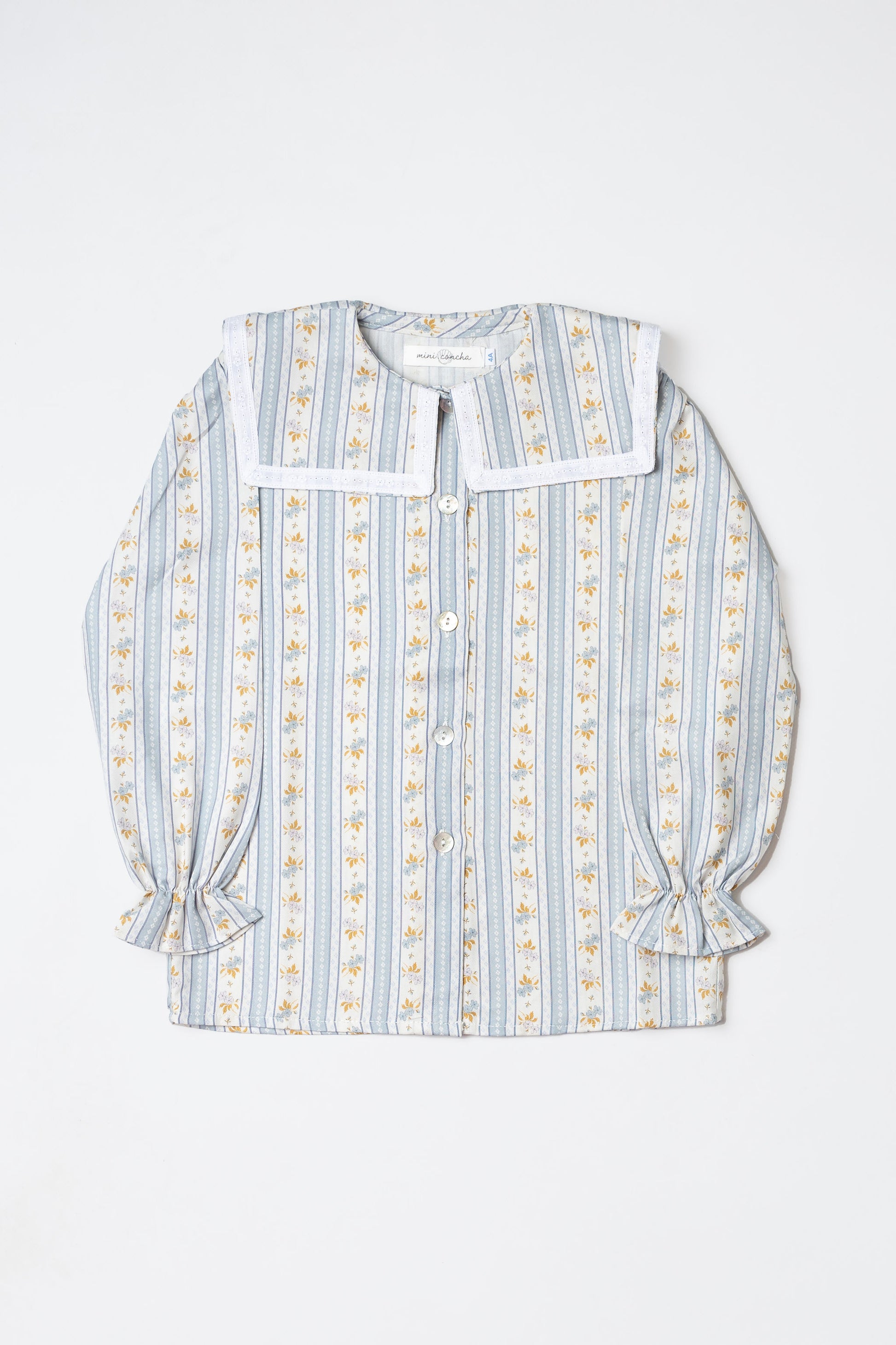 Blouse in 100% cotton fabric, ideal for mid-season, with a delicate floral print in shades of blue. Collar with white embroidered detail. Mother-of-pearl buttons at the front and cuffs with soft elastic to ensure a comfortable fit and freedom of movement.