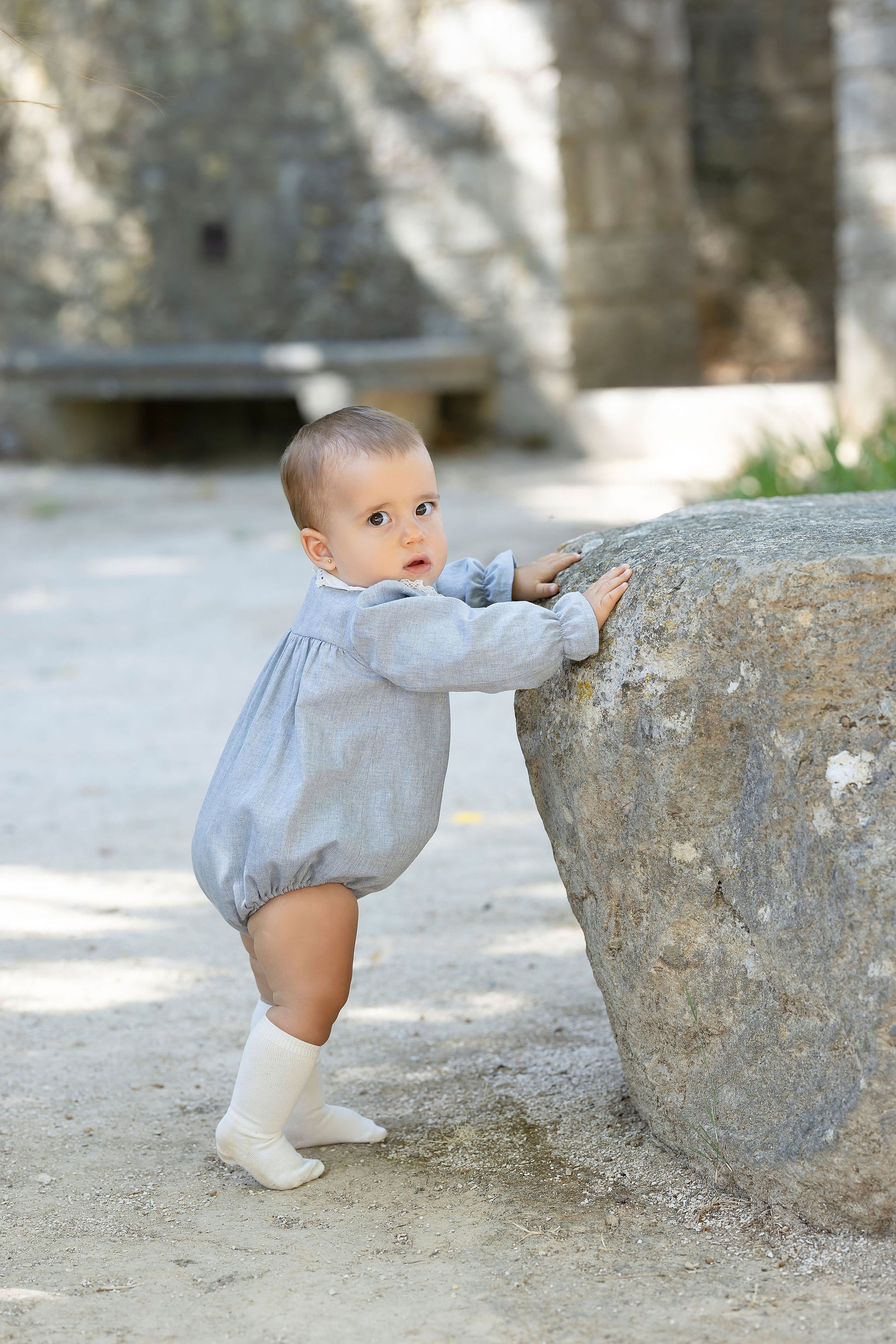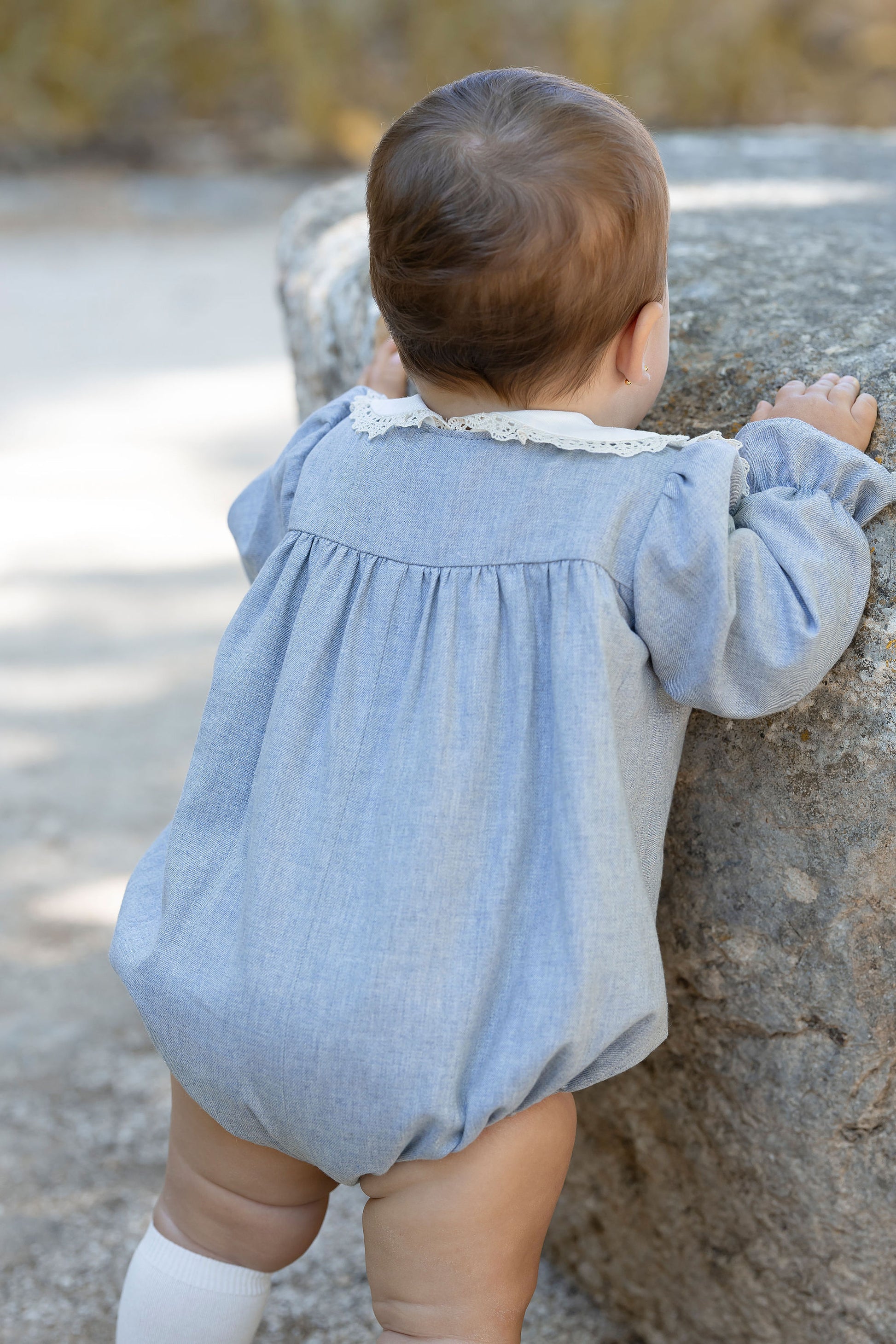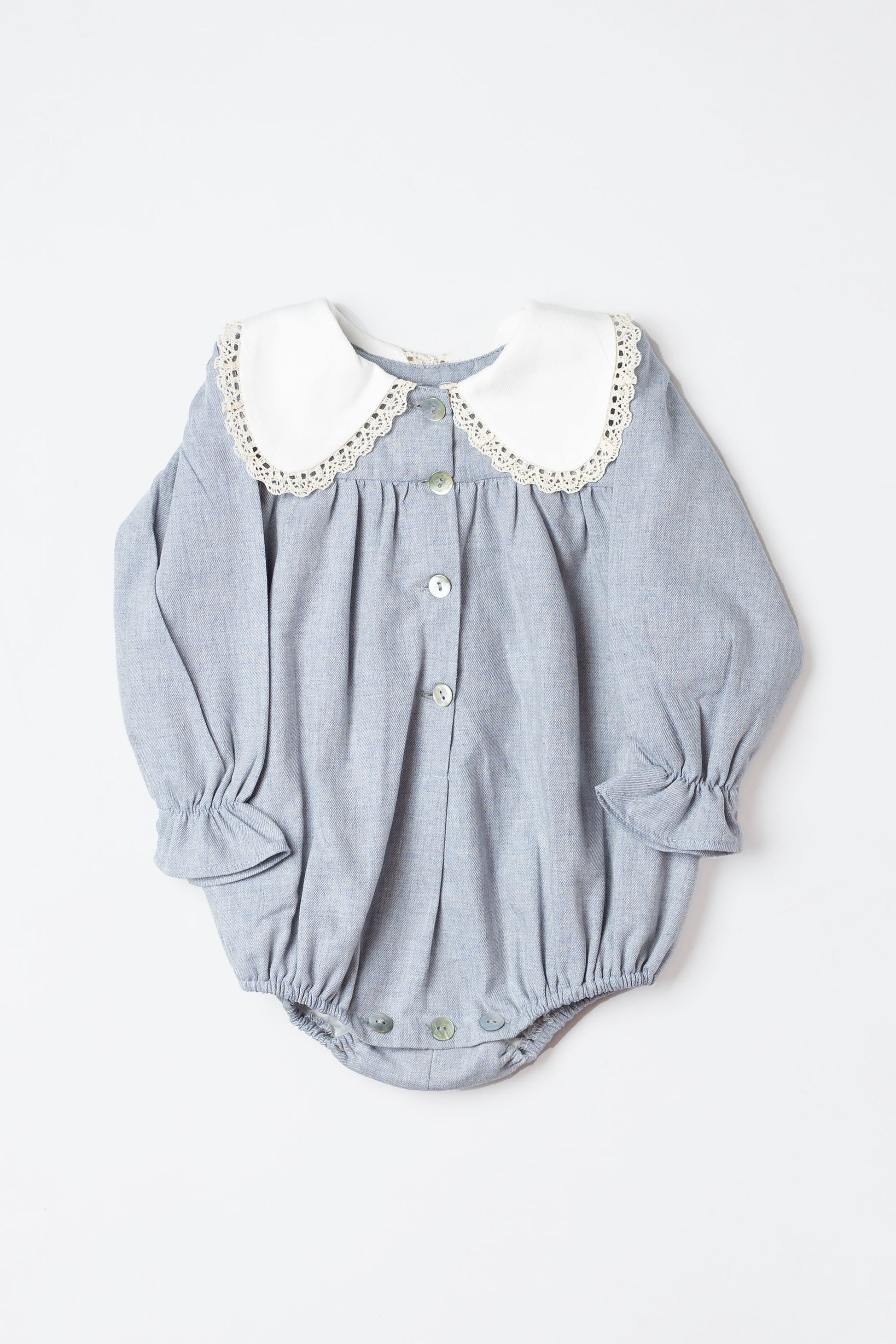 Cute dress made from 100% cotton fabric with brushed lining. Features a round neck and lace trim. Fastens with mother-of-pearl buttons at the front and crotch. Soft elastic at the legs and cuffs for greater comfort and a perfect fit.