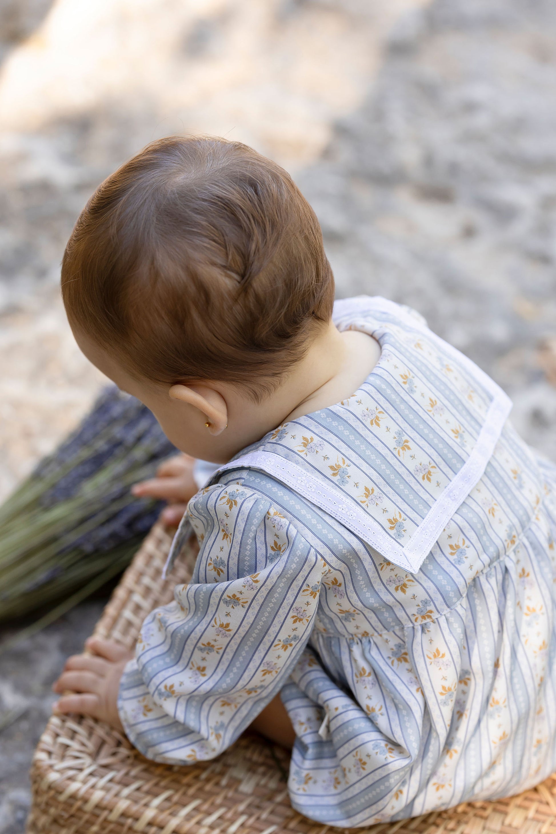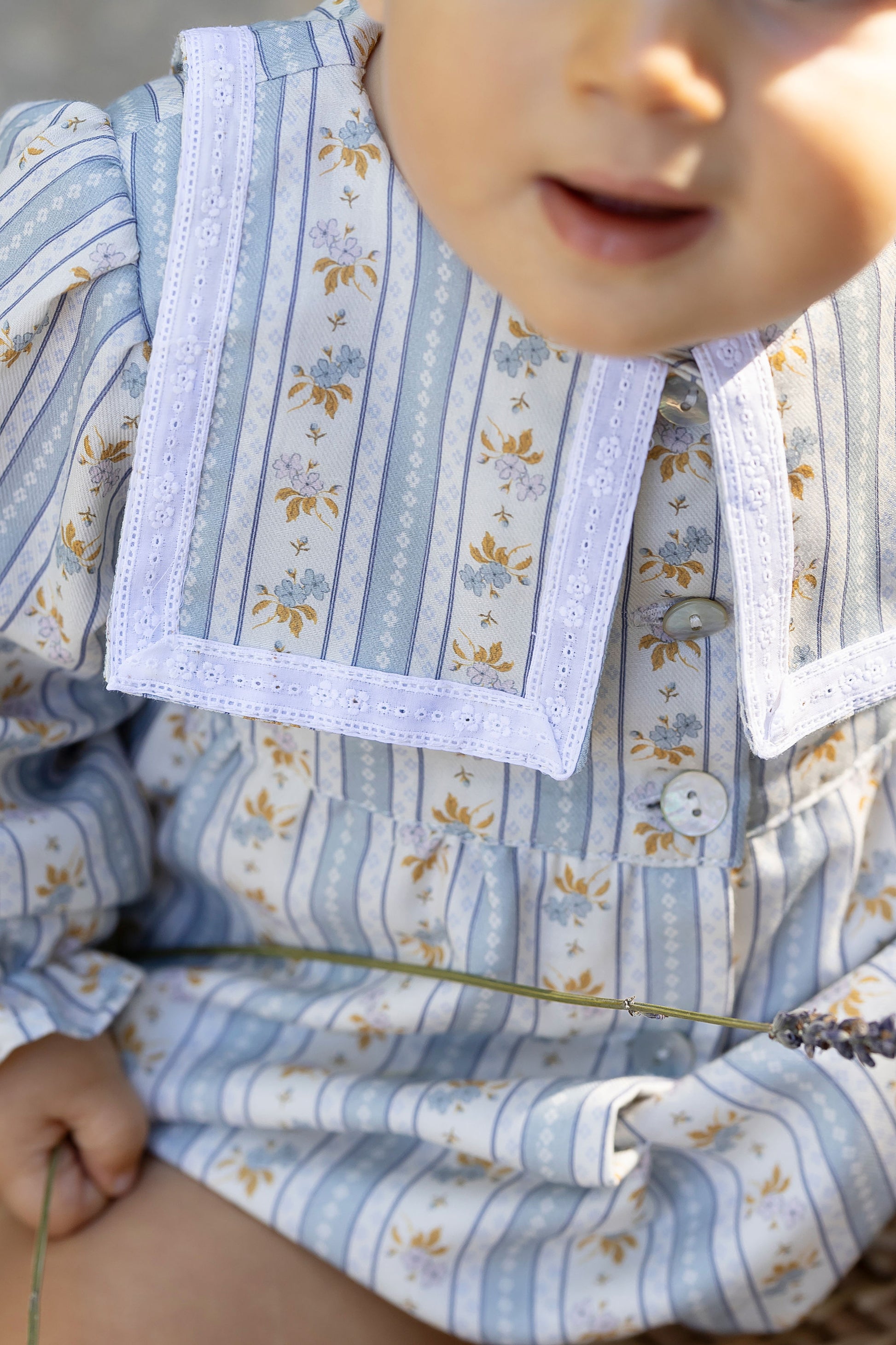 Cute 100% cotton fabric garment with lining, ideal for mid-season wear, featuring a delicate floral print in shades of blue. The collar has white embroidery and mother-of-pearl buttons at the front and between the legs. Soft elastic at the legs and cuffs ensures a comfortable fit and freedom of movement.