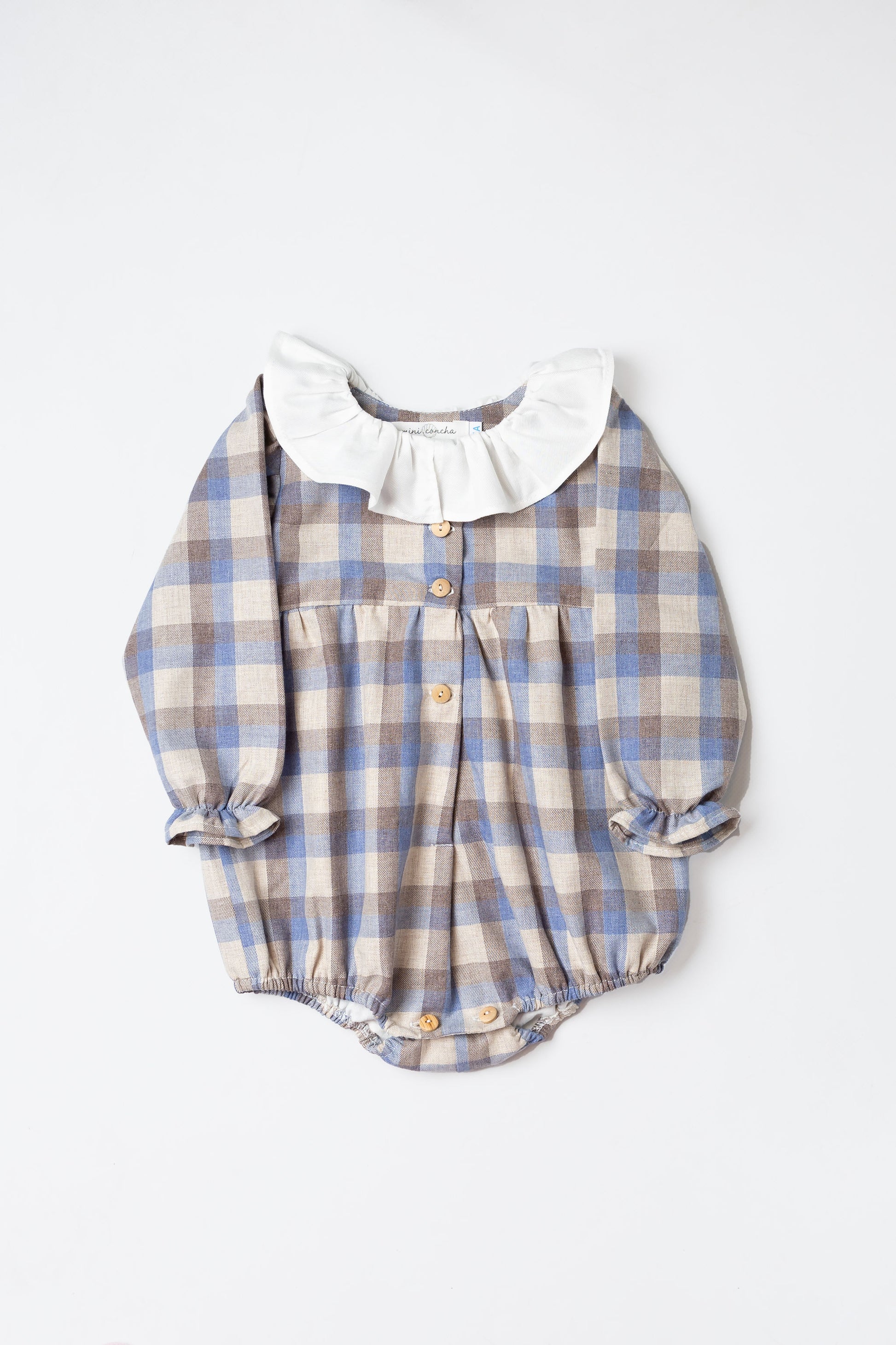 Cute and soft cotton fabric with an inner lining. The checkered pattern in shades of blue and beige brings a classic and timeless touch, while the white collar adds a delicate and elegant detail. Features soft elastic at the cuffs and legs for added comfort. Front opening with wooden buttons and crotch closure. A cozy piece to accompany your baby's first steps.