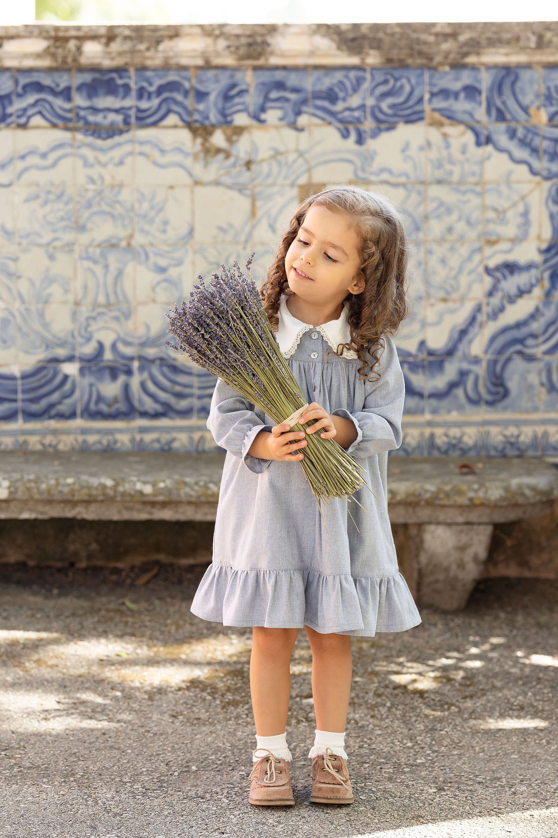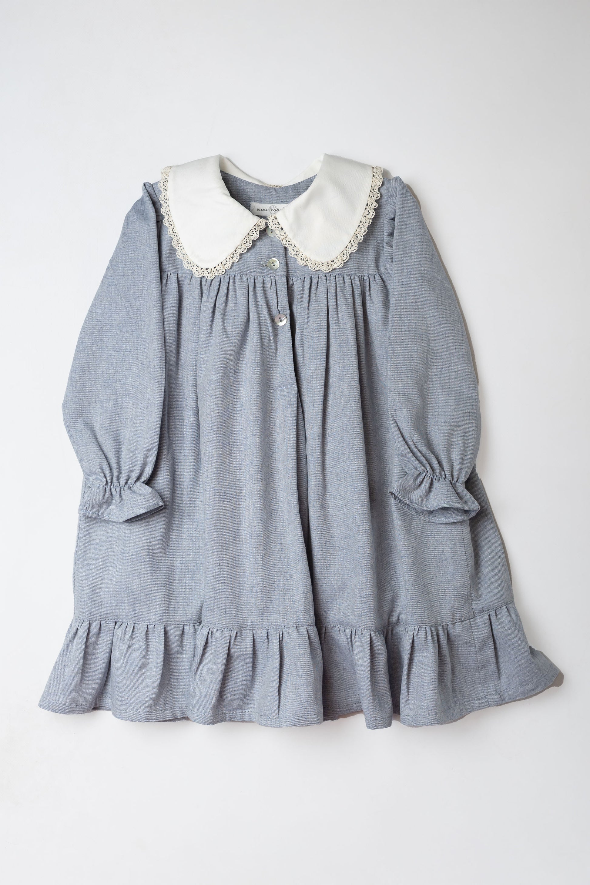 Blue dress, made of 100% cotton fabric with a brushed lining. It fastens at the front with mother-of-pearl buttons and features a ruffle at the bottom of the dress that gives it a casual and very comfortable feel.