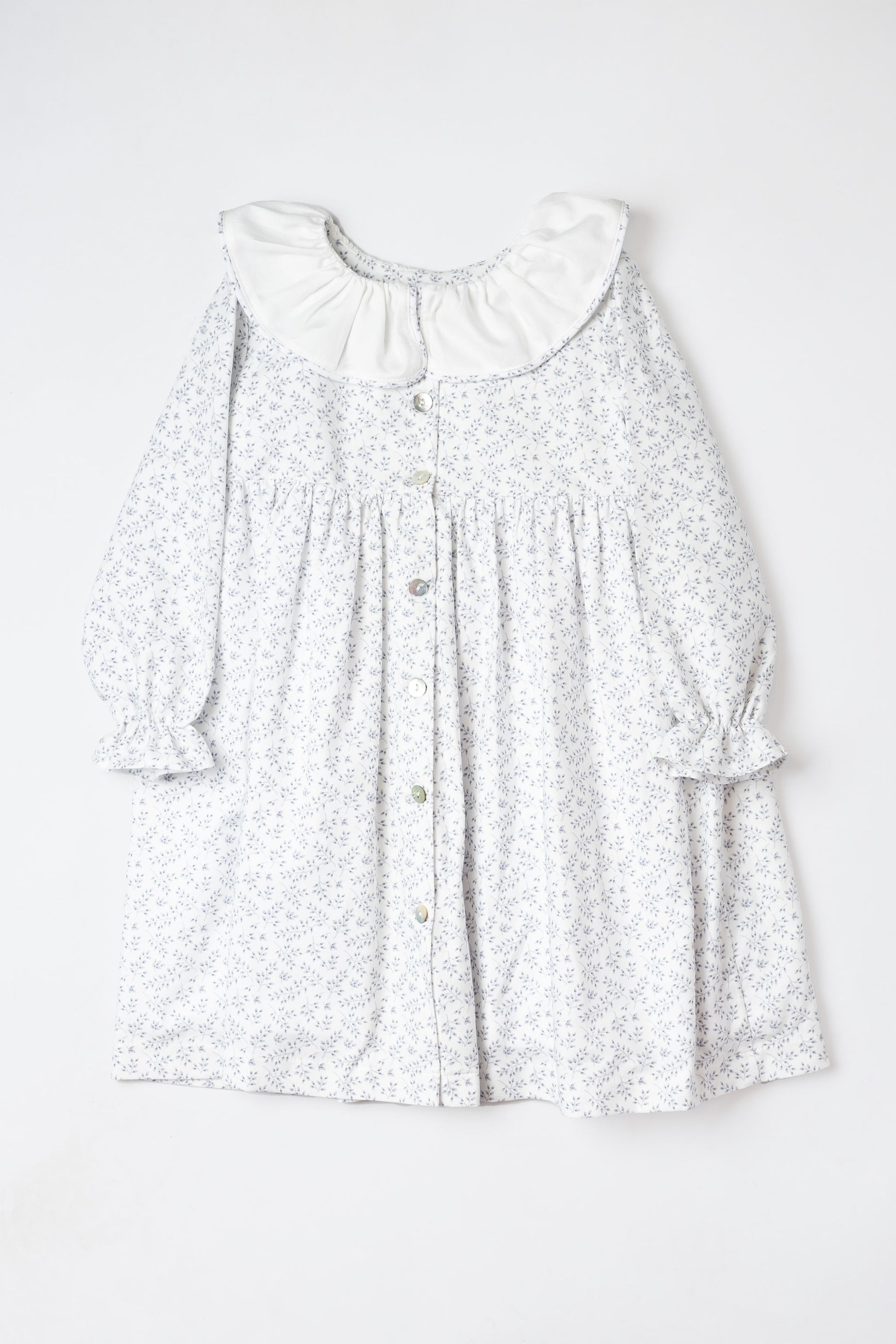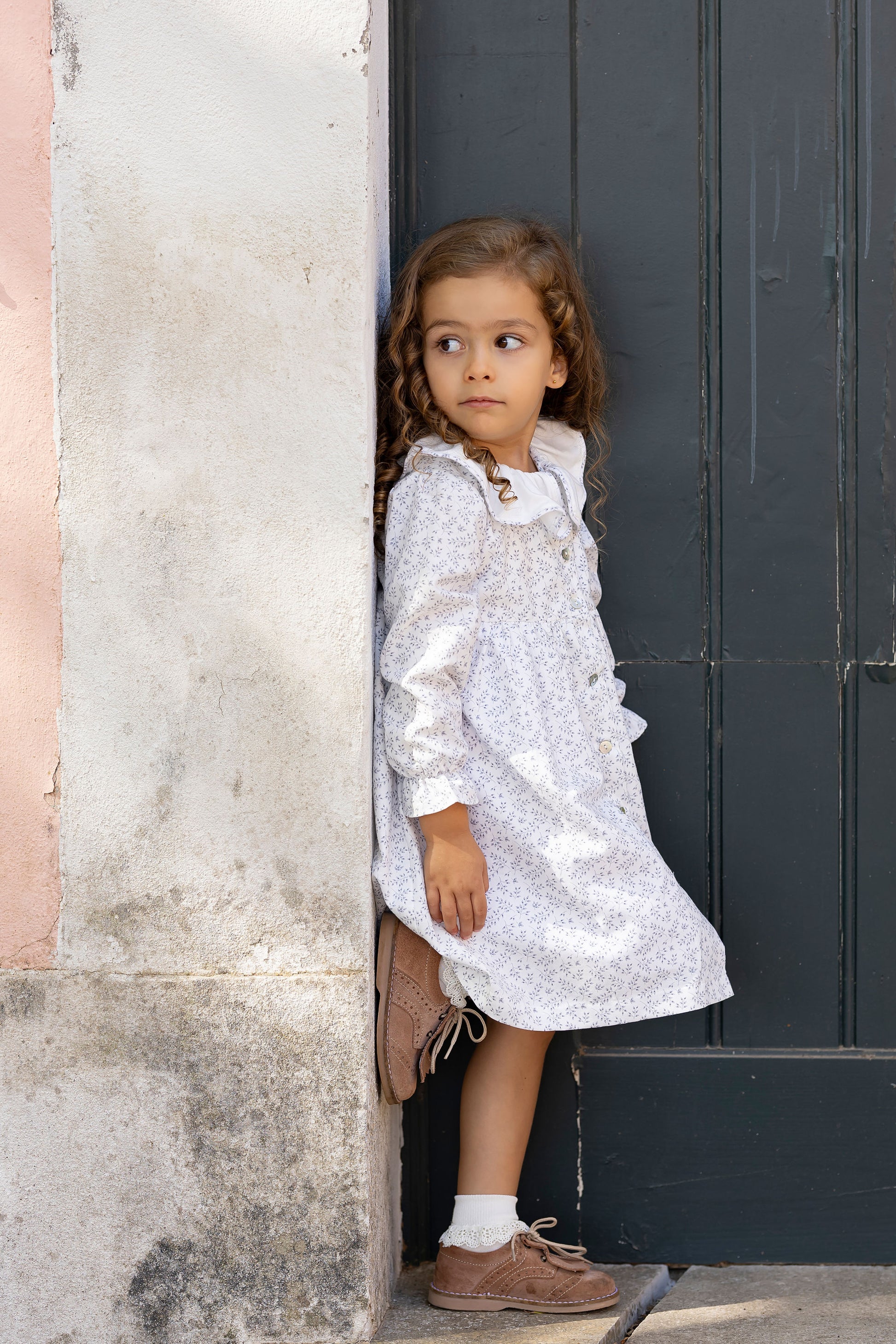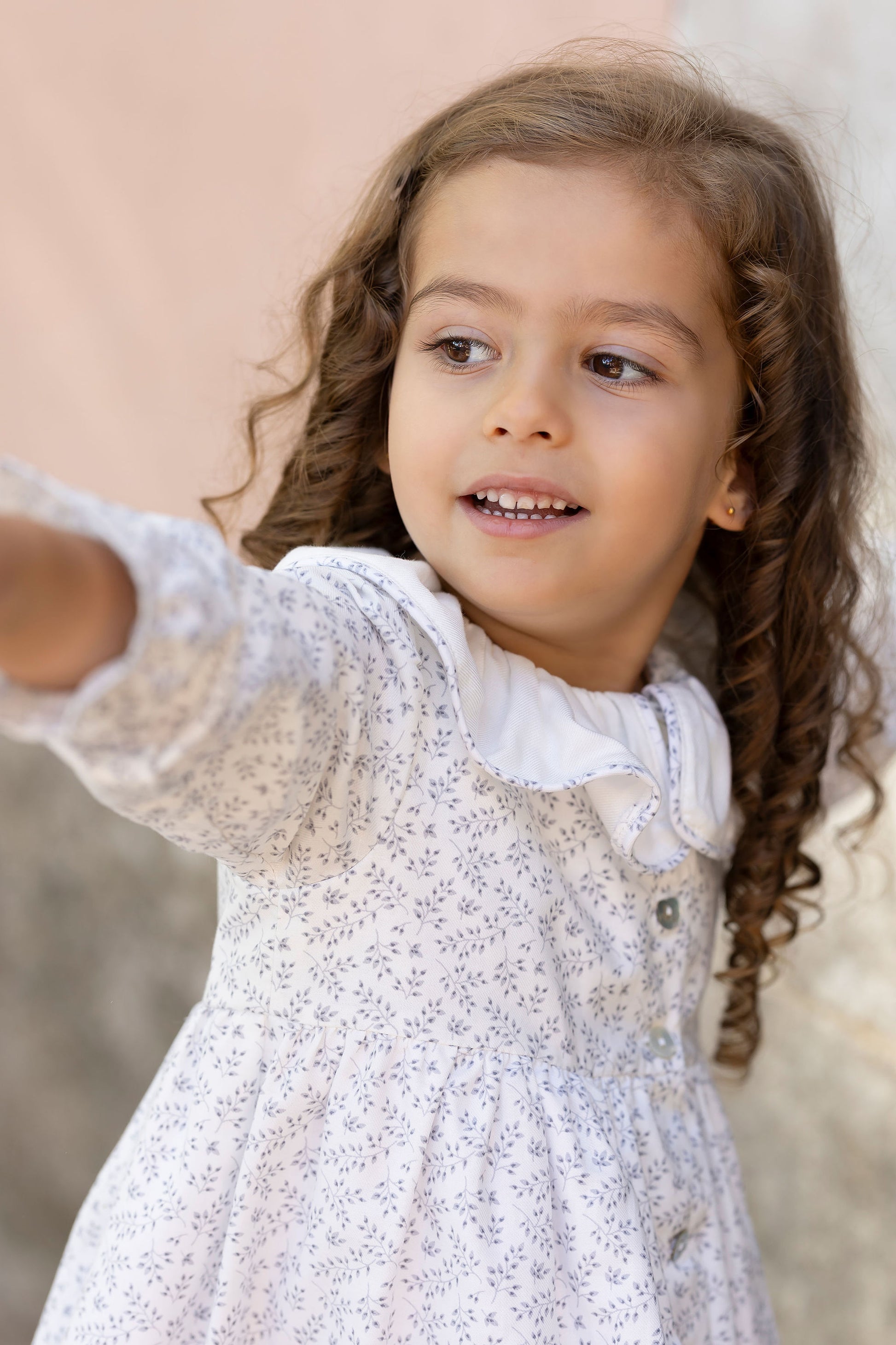 Dress made from 100% cotton fabric, with a delicate leaf print in shades of blue. Features a white collar with a gathered detail, mother-of-pearl buttons on the front, and soft elastic cuffs for added comfort. An inner lining ensures extra warmth without sacrificing lightness. A timeless classic that combines elegance and practicality for cooler days.