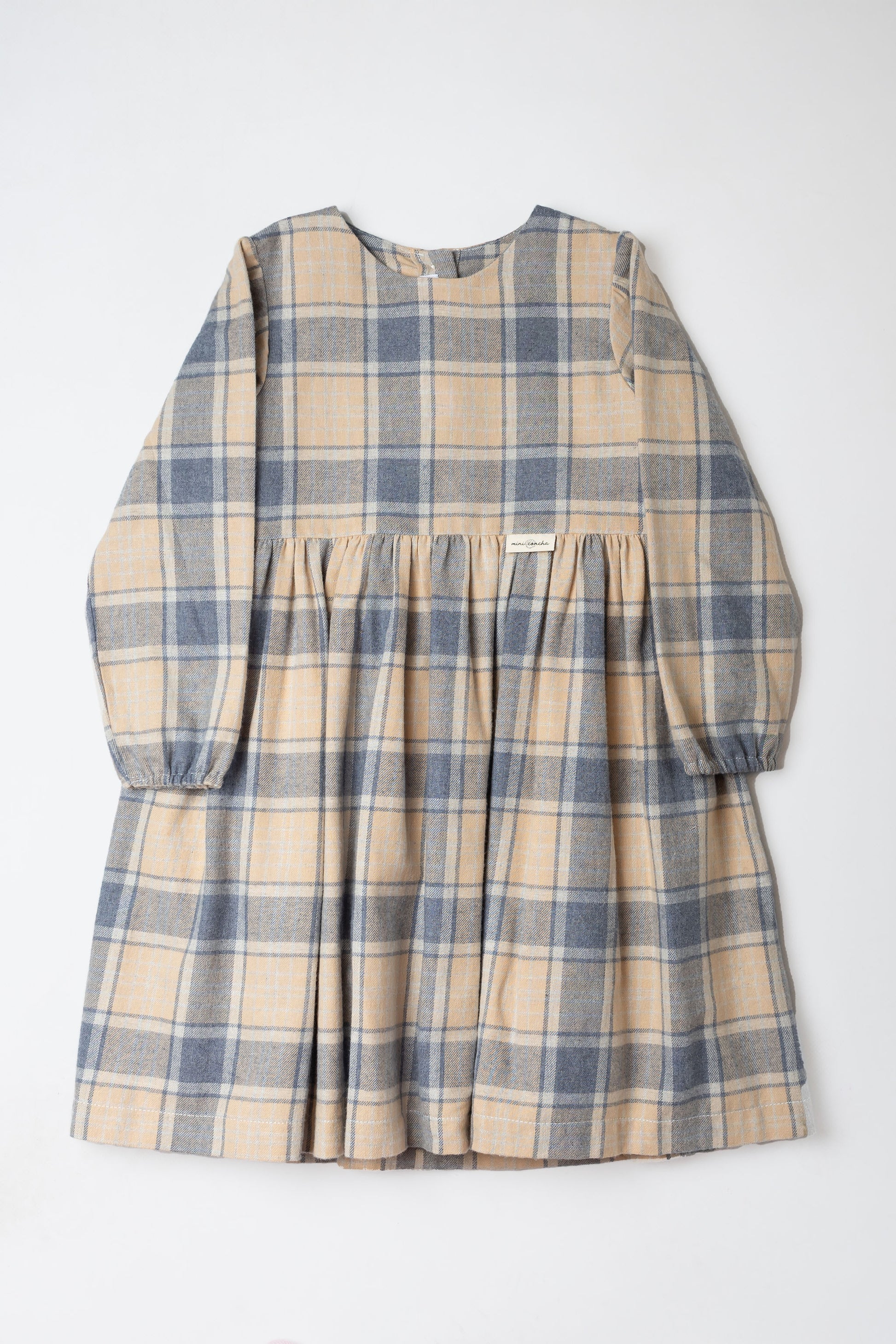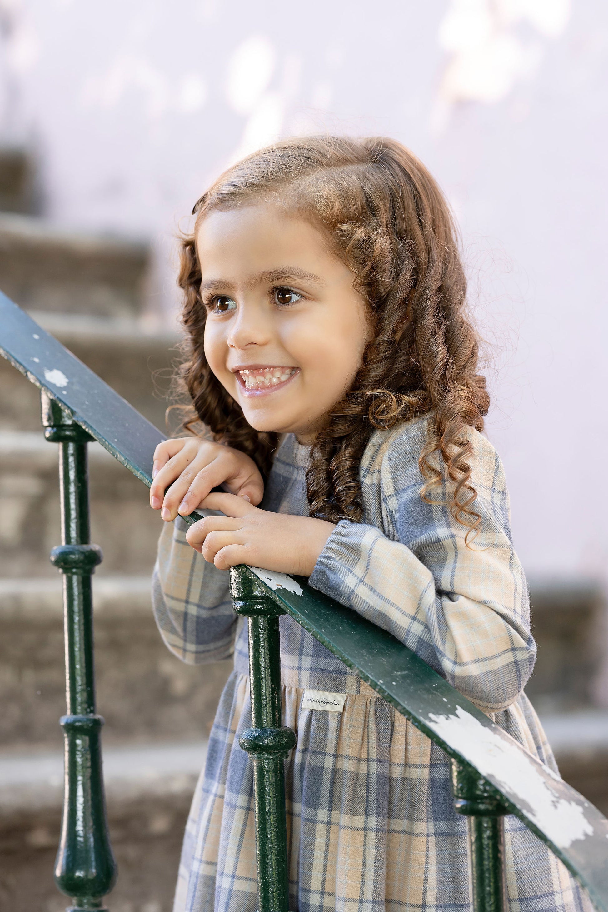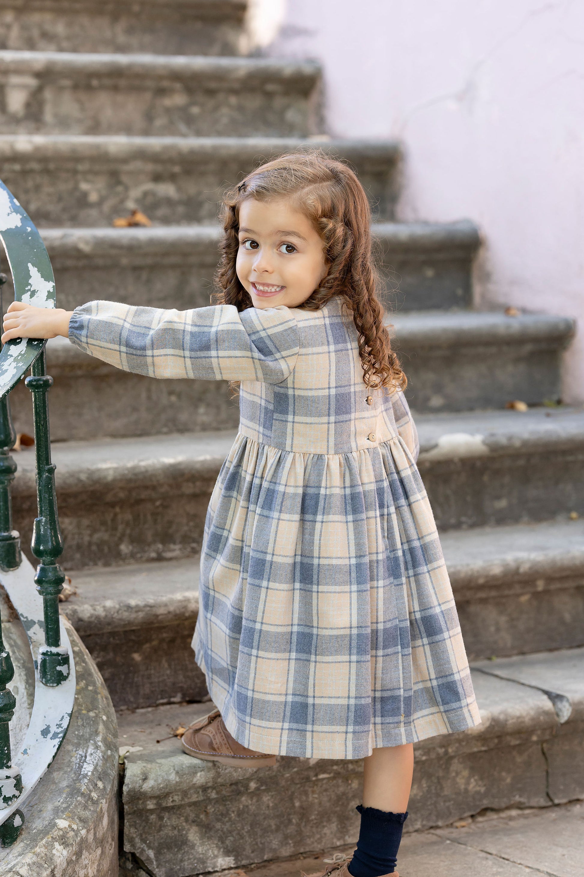 A charming dress in a blue and yellow plaid pattern, designed to accompany girls on all occasions. Featuring a classic cut, long sleeves, and button detail at the back. The soft 100% cotton fabric, warm for the Autumn/Winter season, ensures freedom of movement, while the delicate design adds a traditional touch. A versatile everyday style that can be paired with a ruffled blouse for an even more special touch.